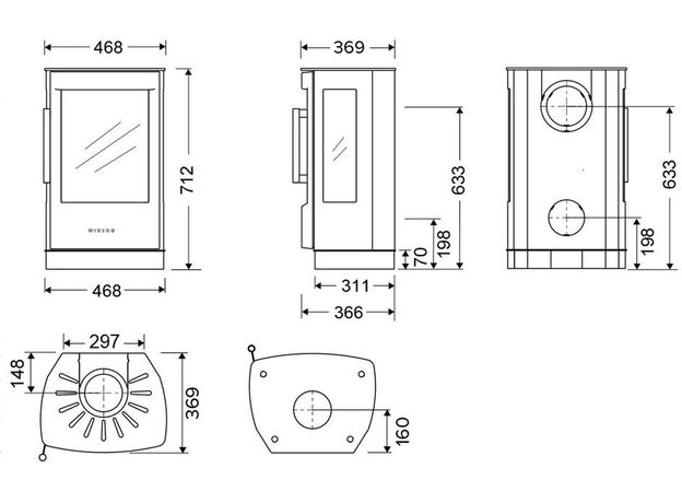 Габариты. Печь не занимает много места, не требует большого пространства для установки. При этом Wiking Miro имеет огромное остекление. Для установки печи не нужен фундамент. Её можно устанавливать на любой тип полового покрытия. В том числе на деревянные полы или на ламинат. Нижняя часть Викинг Миро не нагревается СОВСЕМ. Для защиты от возможного попадания случайных угольков на пол мы укладываем перед печью небольшой стальной или стеклянный притопочный лист.