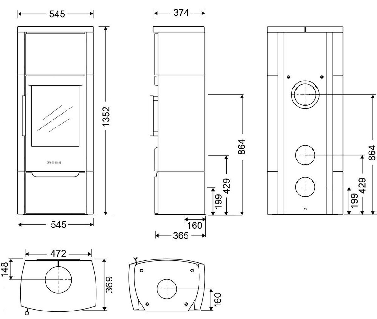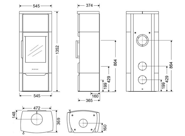 Мощность печи от 3 до 8 кВт позволяет легко и эффективно отопить площадь от 20 до 80м². Номинальная мощность — 5кВт дана производителем как средняя, в ней печь работает в оптимальном режиме и в максимальном КПД.